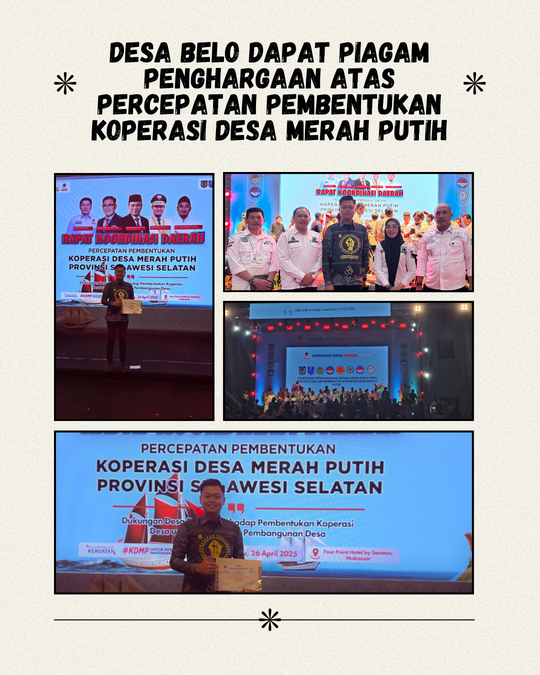 Pemerintah Desa Belo Kecamatan Ganra, Kabupaten Soppeng telah menerima piagam Penghargaan atas komitmennya dalam percepatan pembentukan Koperasi Desa (KopDes) Merah Putih Tahun 2025.