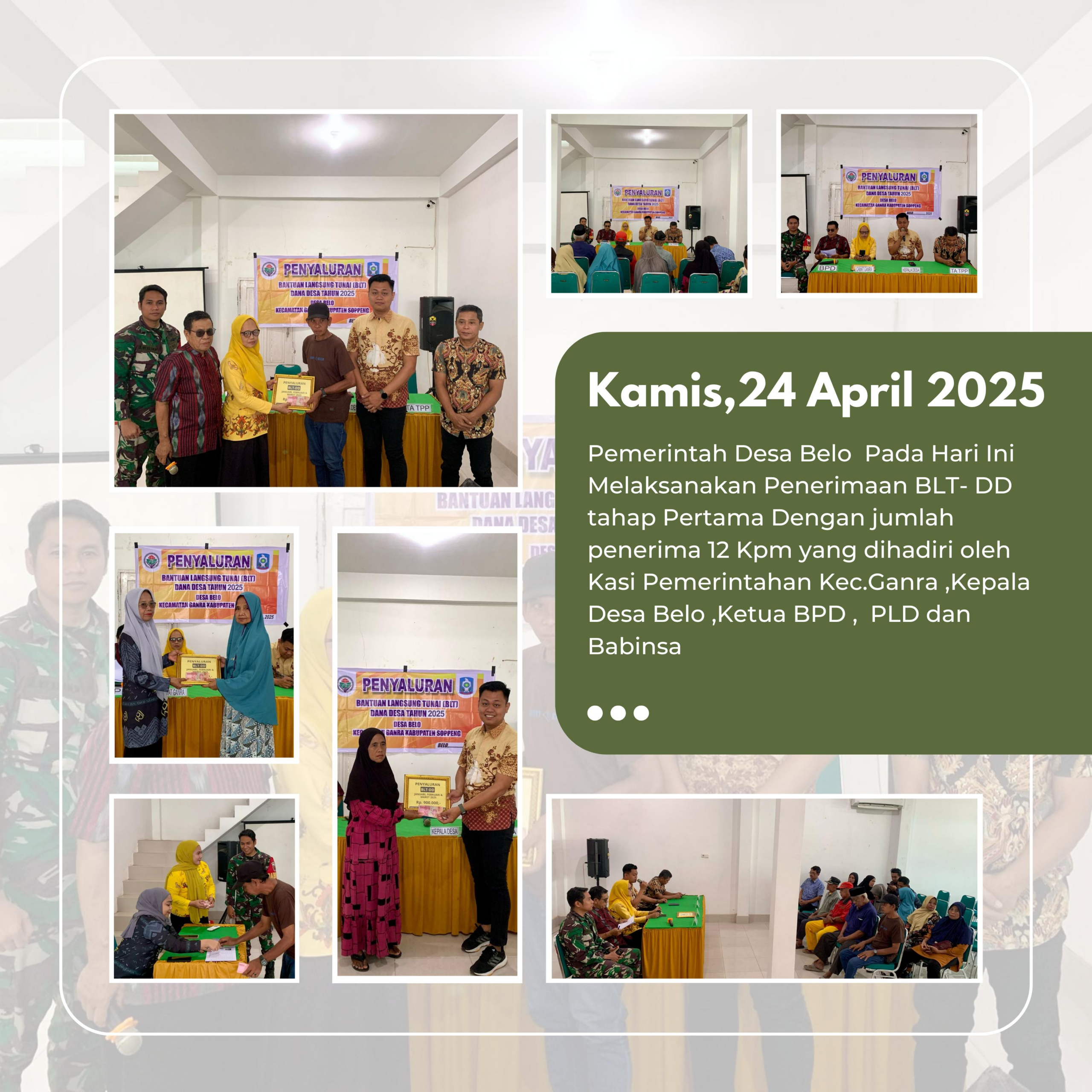 Belo, [24 April 2025] – Pemerintah Desa Belo, Kecamatan Ganra, Kabupaten Soppeng, menyalurkan Bantuan Langsung Tunai (BLT) Dana Desa Triwulan Pertama Tahun 2025 kepada Keluarga Penerima Manfaat (KPM) sebagai bagian dari komitmen pemerintah dalam mendukung program percepatan penghapusan kemiskinan ekstrem di Indonesia.