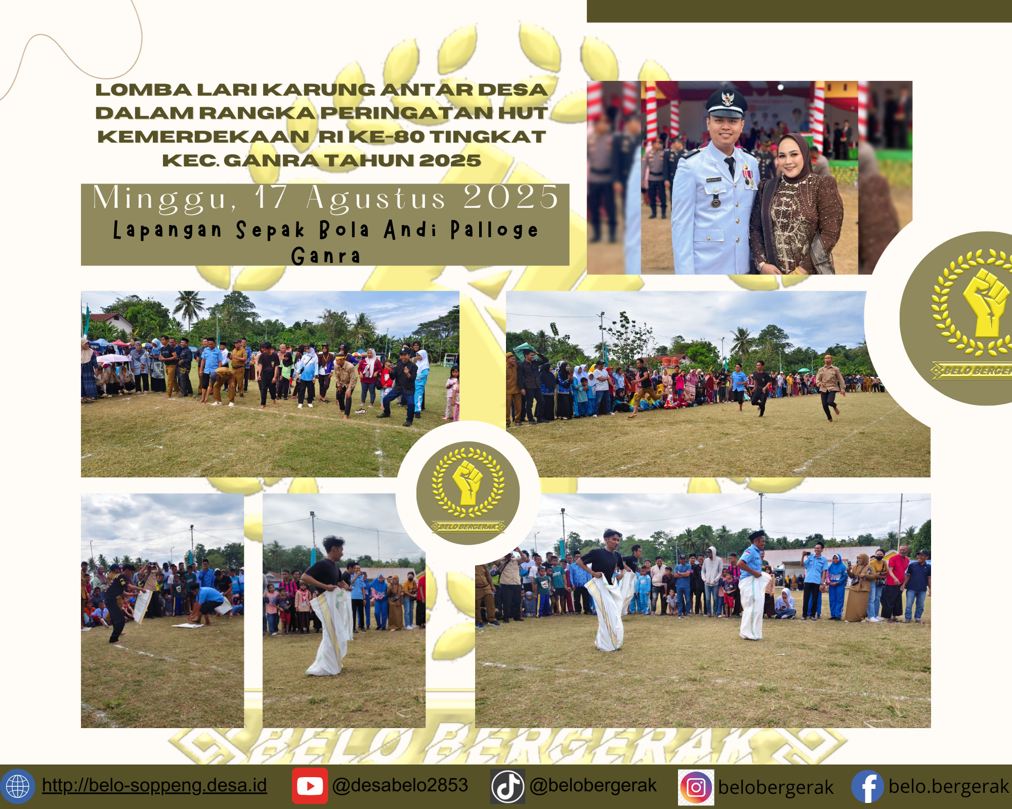 Dalam rangka memeriahkan peringatan HUT Kemerdekaan RI ke-80 Tahun 2025, Pemerintah Kecamatan Ganra Kabupaten Soppeng menggelar Lomba Lari Karung Antar Desa yang berlangsung meriah di Lapangan Sepak Bola Andi Palloge Kecamatan Ganra], pada Hari Kamis (17/08/2025)].