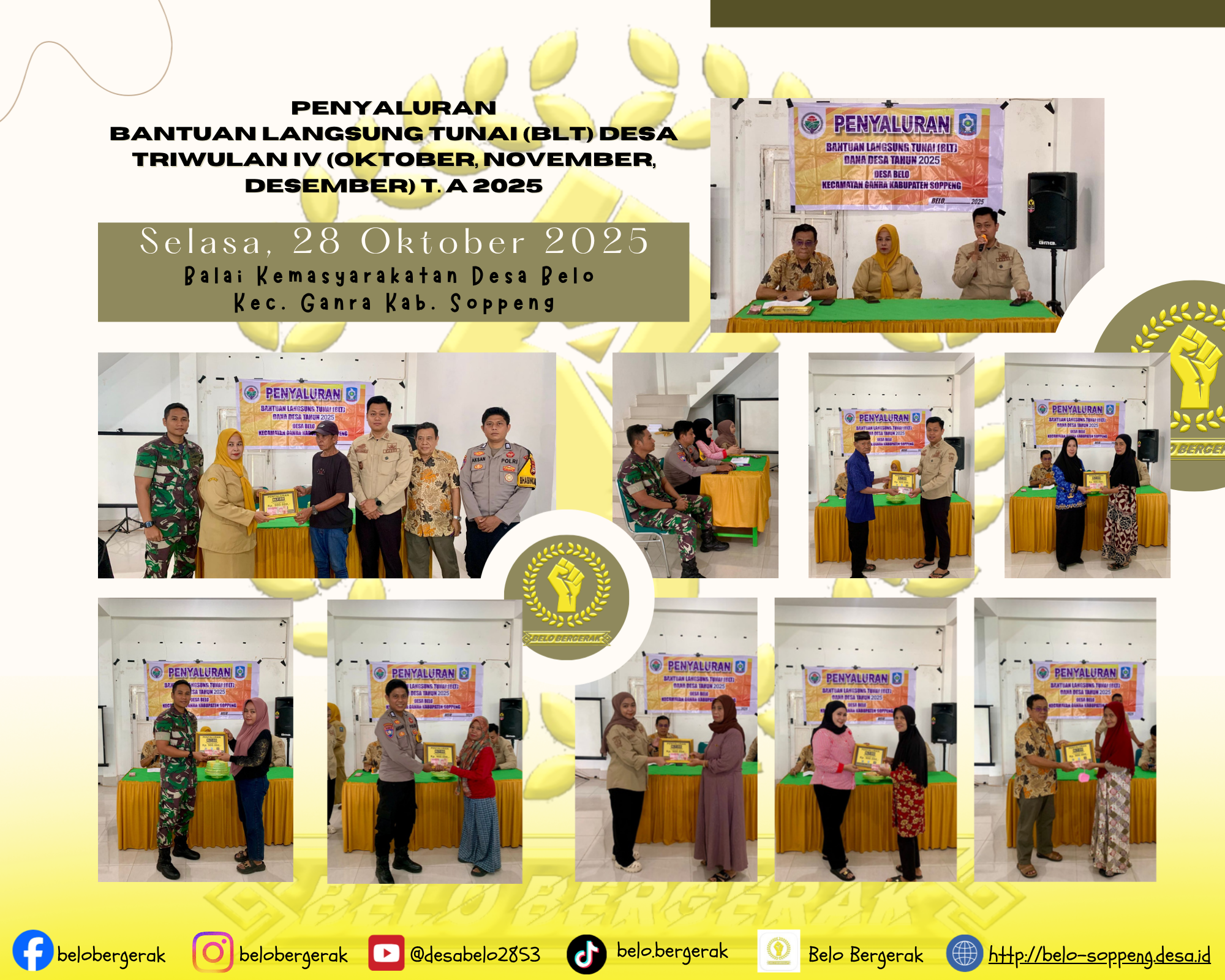 Belo, 28 Oktober 2025 – Pemerintah Desa Belo, Kecamatan Ganra, Kabupaten Soppeng kembali menyalurkan Bantuan Langsung Tunai (BLT) Dana Desa tahap triwulan keempat untuk bulan Oktober, November, dan Desember Tahun Anggaran 2025. Kegiatan ini dilaksanakan di Balai Kemasyarakatan Desa Belo dan dihadiri langsung oleh Kepala Desa Belo bersama jajaran perangkat desa, Kasi Kesra Kec. Ganra, BPD, Babinsa Dan Bhabinkamtibmas .