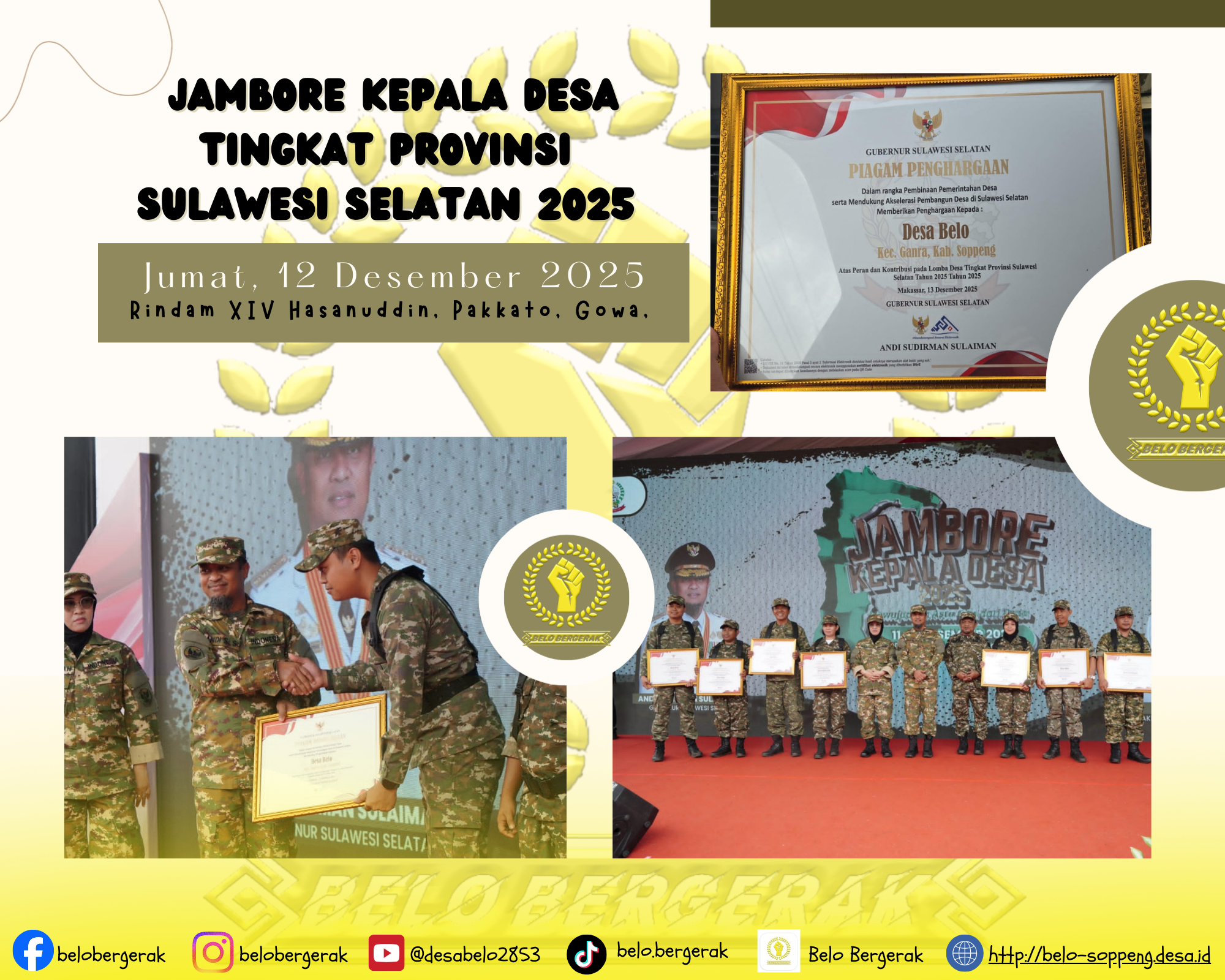 Kepala Desa Belo menghadiri Jambore Kepala Desa Tingkat Provinsi Sulawesi Selatan Tahun 2025 yang diselenggarakan di Rindam XIV Hasanuddin, Pakkati, Kabupaten Gowa. Kegiatan ini diikuti oleh kepala desa dari seluruh kabupaten/kota se-Sulawesi Selatan sebagai ajang silaturahmi, peningkatan kapasitas, serta penguatan sinergi kepemimpinan desa.