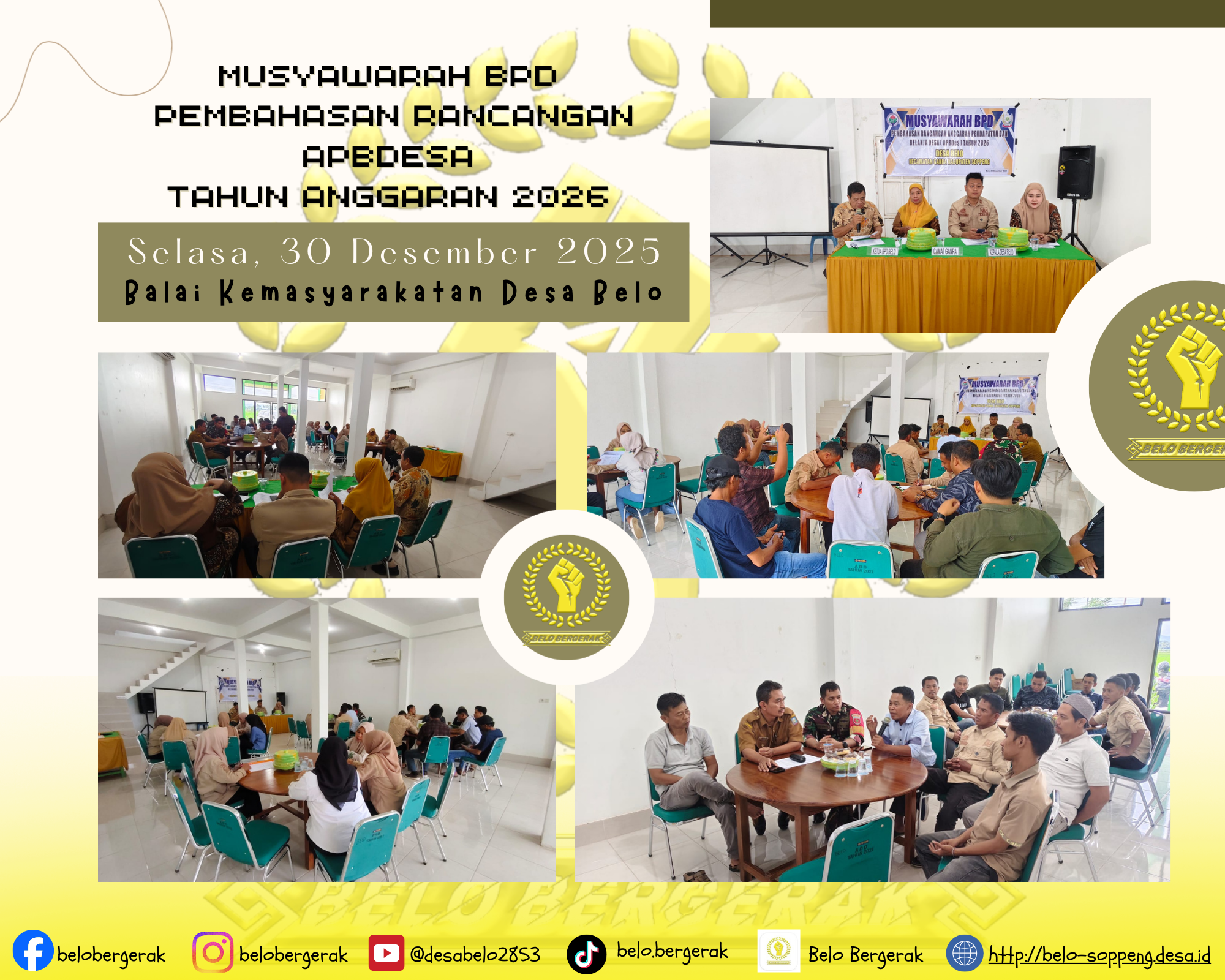 Pemerintah Desa Belo, Kecamatan Ganra, Kabupaten Soppeng, melaksanakan Musyawarah Pembahasan Rancangan Anggaran Pendapatan dan Belanja Desa (APBDesa) Tahun Anggaran 2026 sebagai bagian dari tahapan perencanaan dan penganggaran pembangunan desa. Kegiatan ini berlangsung di Balai Desa Belo dengan dihadiri oleh berbagai unsur pemerintahan dan masyarakat desa.