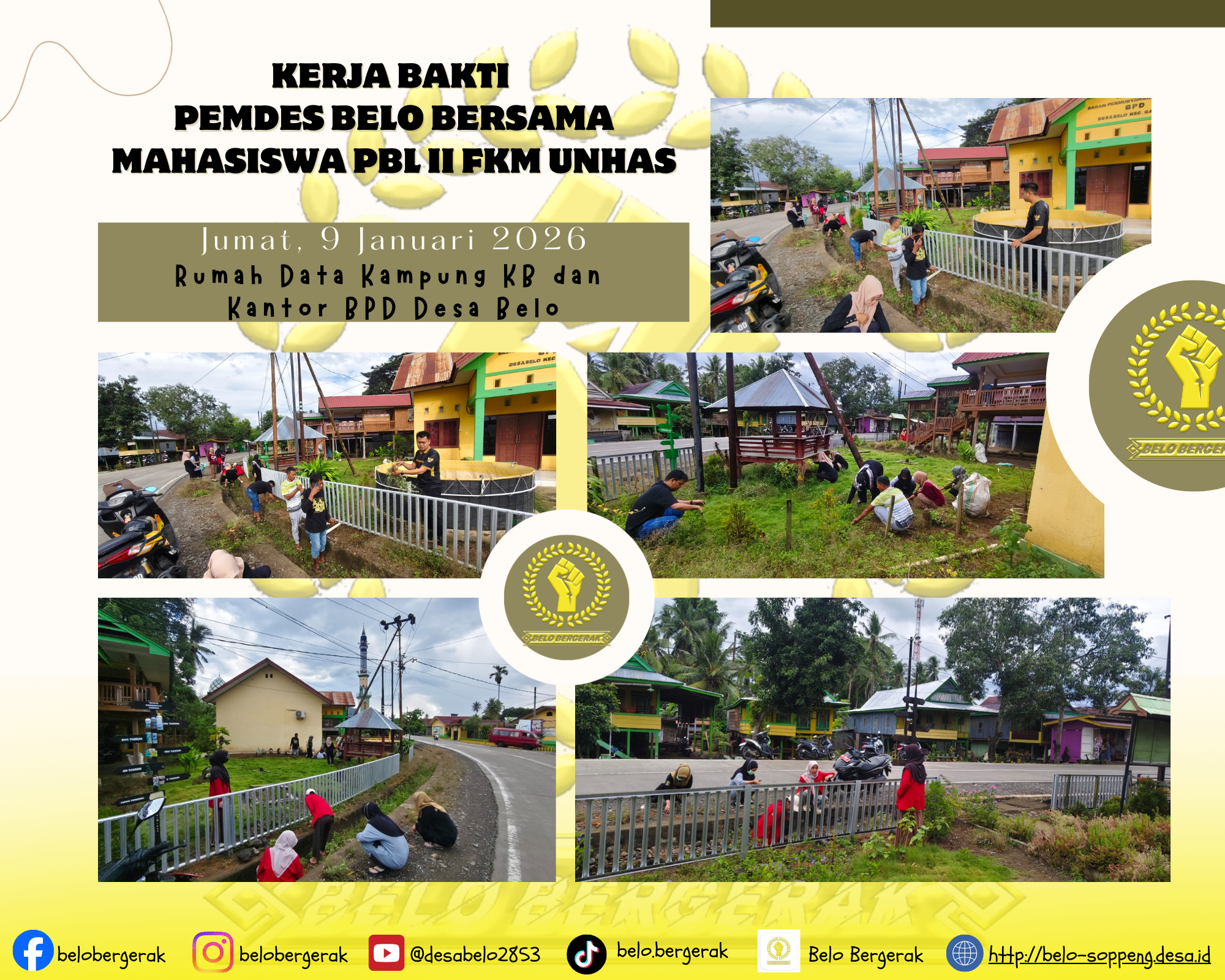 Pemerintah Desa Belo bersama mahasiswa Praktik Belajar Lapangan (PBL) Fakultas Kesehatan Masyarakat (FKM) Universitas Hasanuddin melaksanakan kegiatan kerja bakti di Rumah Data Kampung KB dan Kantor Badan Permusyawaratan Desa (BPD) Desa Belo, Kecamatan Ganra, Kabupaten Soppeng.