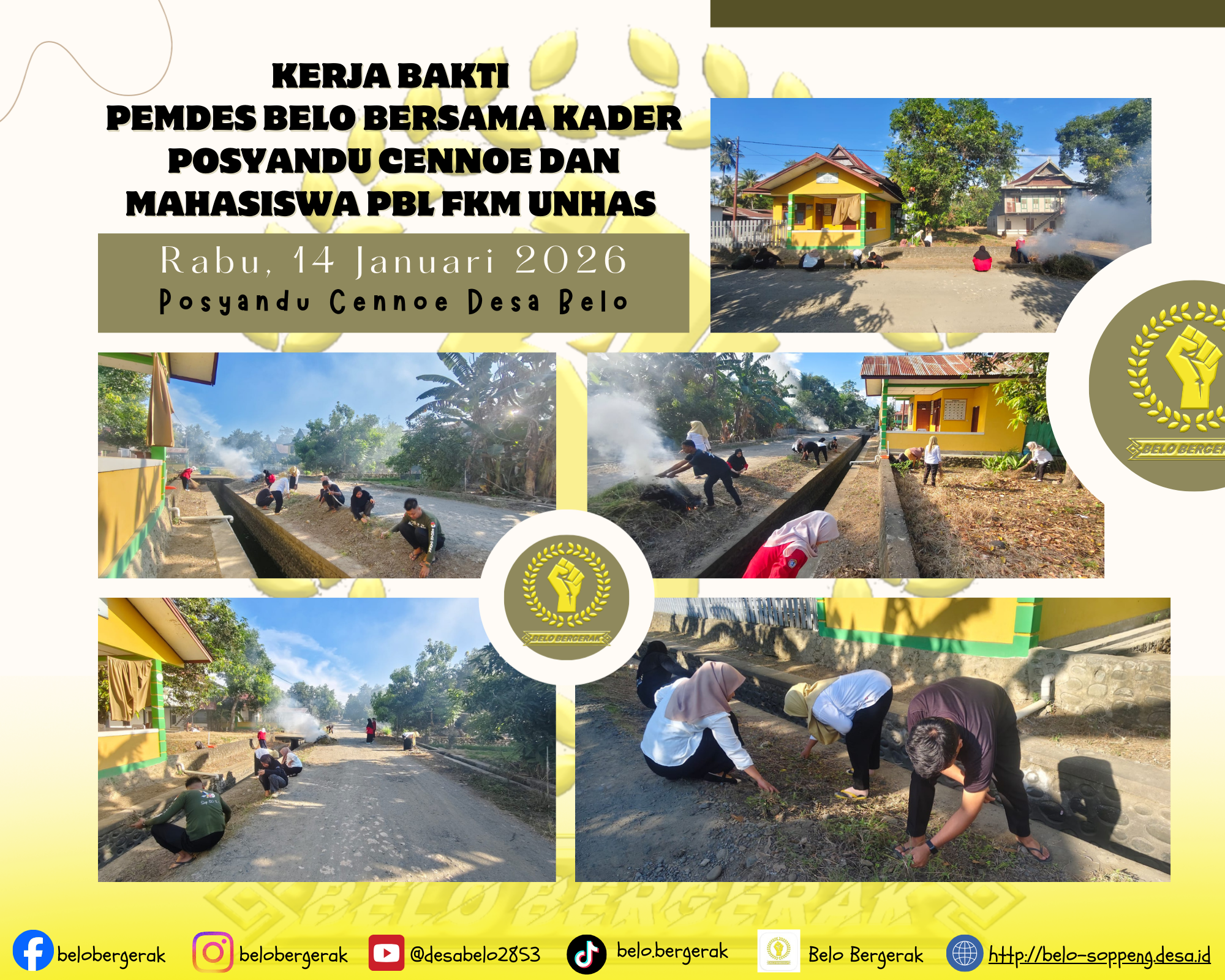 Pemerintah Desa Belo bersama kader Posyandu serta mahasiswa Praktik Belajar Lapangan (PBL) Fakultas Kesehatan Masyarakat (FKM) Universitas Hasanuddin melaksanakan kegiatan kerja bakti di Posyandu Cennoe, Desa Belo, Kecamatan Ganra, Kabupaten Soppeng.